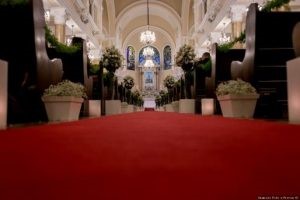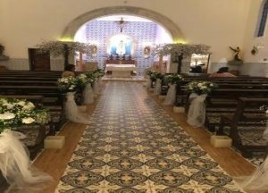 E antes de chegarmos ao tapete da nave, algumas igrejas, tem uma porta intermediária, e entre ela e a porta da rua, algumas noivas optam por uma decoração, com tapete, flores, velas e outros elementos.