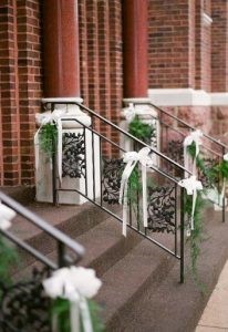 Ainda do lado de fora, podem ser colocados arranjos florais, arco de flores na porta, iluminação, tapete nas escadarias entre outros elementos.