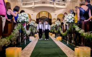 Por fim, ainda falando do corredor, você pode ter a opção de isolar o corredor, dessa forma, os convidados, obrigatoriamente, precisam entrar pela outra entrada dos bancos, e também a nave fica um pouco mais restrita, já que eles não vão conseguir se posicionar muito perto para tirar fotos, o que garante um pouco do espaço ao fotógrafo profissional, esse cordão pode ser de folhagens, de fita de cetim, de voil de tecido, ou ainda de pérolas ou strass, assim, tem bastante opção pra você escolher.