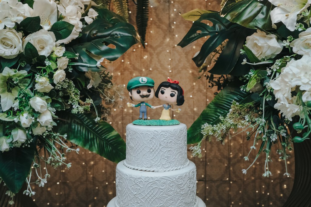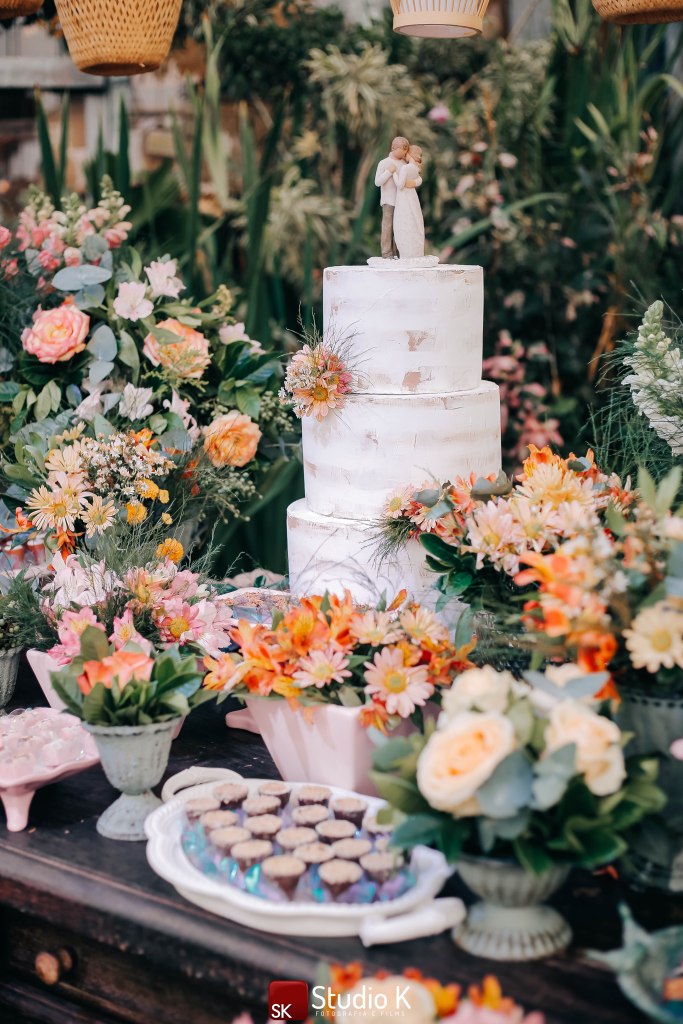 As tendências em topos de bolo evoluem constantemente, refletindo as mudanças nas preferências de estilo e decoração de casamentos. Atualmente, vemos uma forte inclinação para topos de bolo floral, com o uso de flores naturais ou comestíveis, que se harmonizam perfeitamente com o tema e a paleta de cores do casamento sem os antigos bonequinhos de biscuit, que já foram febre há alguns anos.